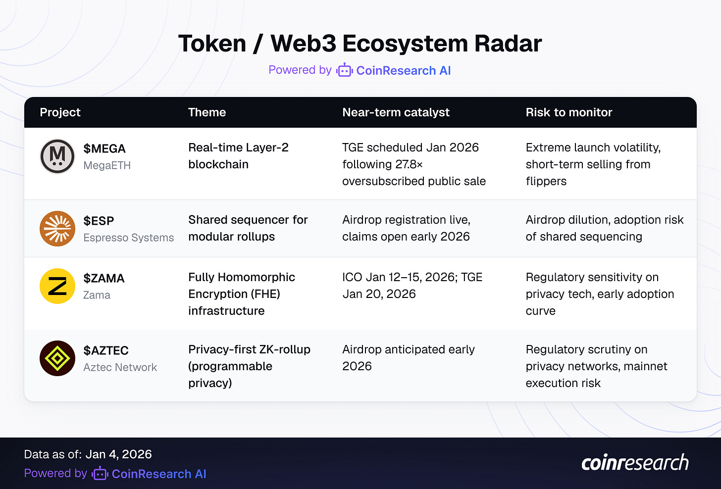 - Monitor TGEs: January is “Launch Month.” Keep liquid capital (stablecoins) ready for the MegaETH and Zama launches. The initial volatility will offer entry opportunities for disciplined allocators who can look past the Day 1 noise.