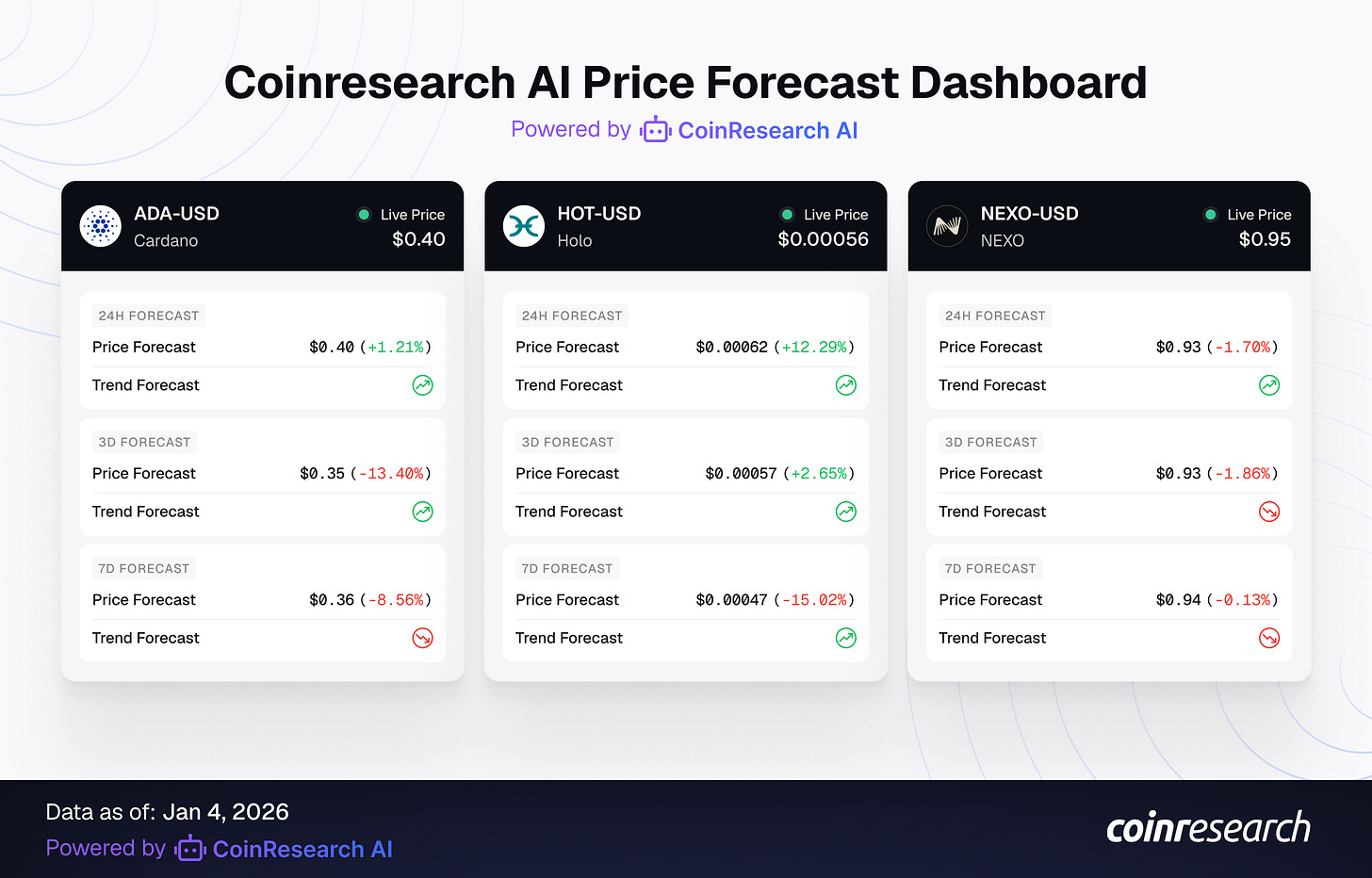 Note: This dashboard presents a snapshot of 3 sample forecasts from CoinResearch AI’s predictive models. The full version includes over 100 continuously updated AI-driven forecasts, accessible to users directly on our platform starting from $9/mo